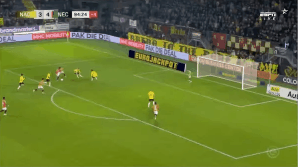 90+4' - 第7个进球 - 佐野航大(奈梅亨) - 射门 (助攻: 勒布雷顿)